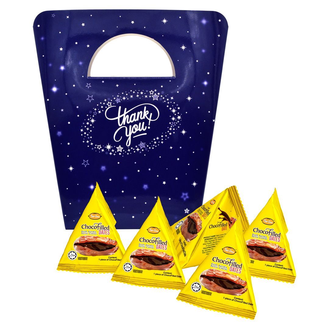 Feature : Individual Chocofilled Pyramid Dates in Door Gift Box printed with "Thank you"
